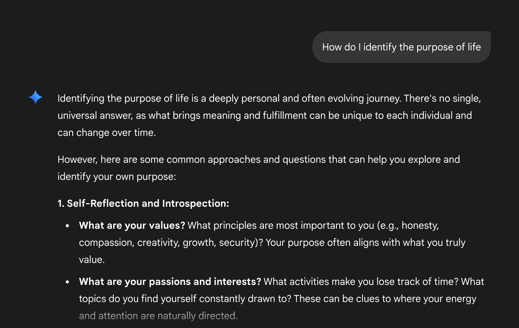 Ask Gemini “How do I identify the purpose of life” and it replies with a rambling answer that is part cliche and part platitude.