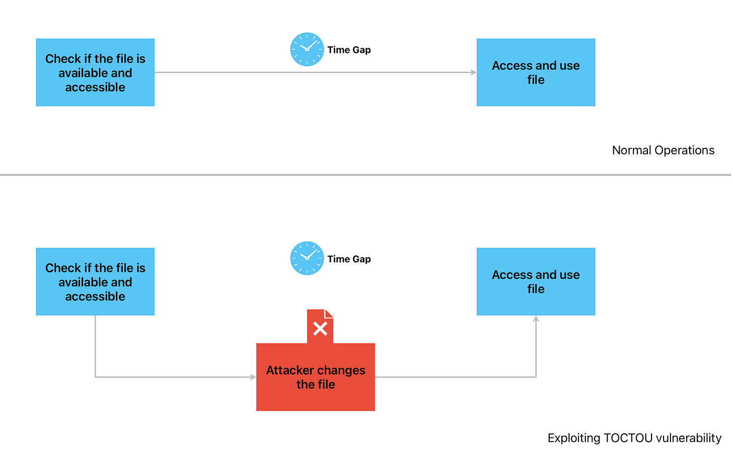 In normal operations, the resource (in this case, a file) is checked for availability and permissions. The resource is then ‘released’, meaning the CPU allows other threads to use it, if required. This is done to maintain efficient operations. Then, maybe a few milliseconds later, the resource is used by the program. This time gap between the two leads to what is known as time of check time of use (TOCTOU) vulnerability.